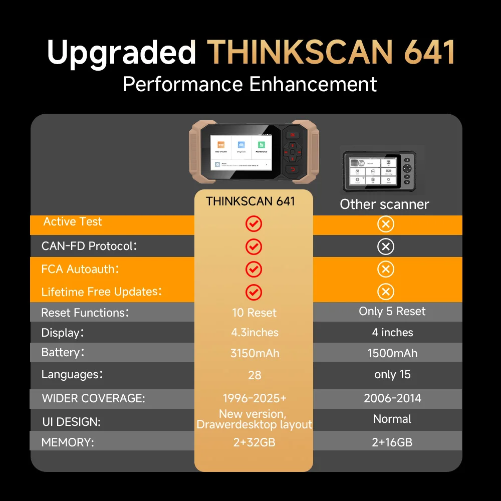 The ThinkScan 641 is a compact, intelligent automotive diagnosis tool. Featuring 4.3-inch color touchscreen, 2GB of RAM, 32GB of storage, and a Bluetooth diagnostic connector, it can diagnosis oven major ECU systems: the engine, automatic transmission, airbags, and ABS. It can read and clear fault codes, and read dynamic data streams and ECU ID information. It also includes 10 maintenance functions, effective addressing daily vehicle maintenance tasks, making it an affordable diagnosis tool.