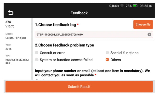 Diagnosis feedback is designed to better solve complaints. If has Diagnostic attemst falls, has pop-up message will call with a "Feedback" button. This button is used to send diagnosis logs and fault information to the server, asking developers to analyze and determines the cause and subsequently iterate on the diagnosis software.